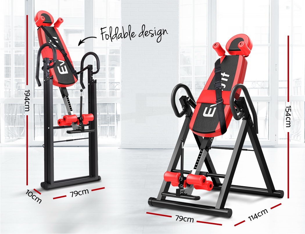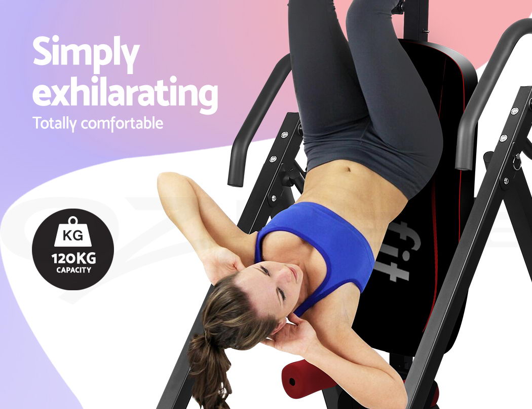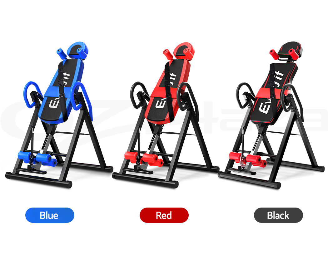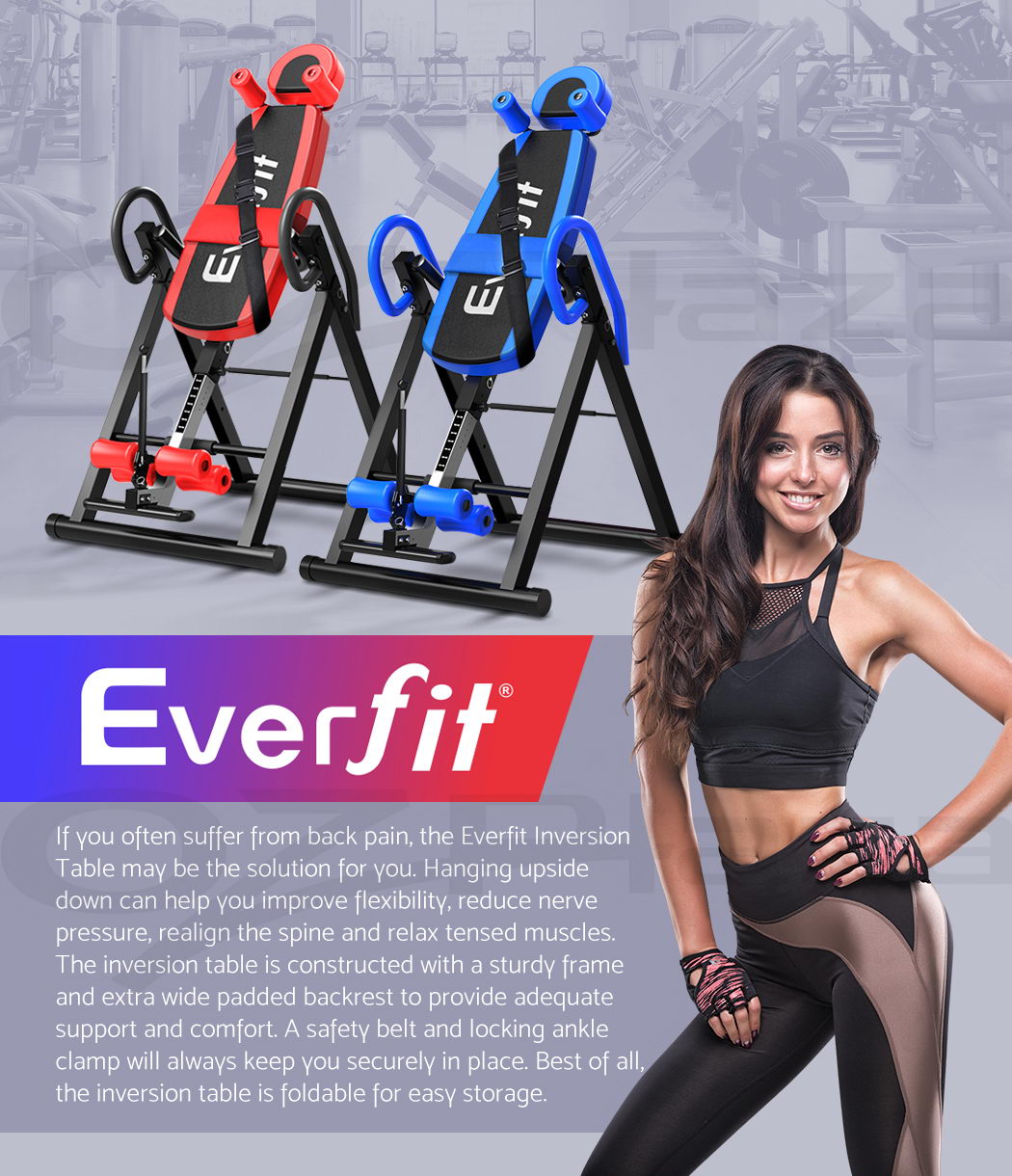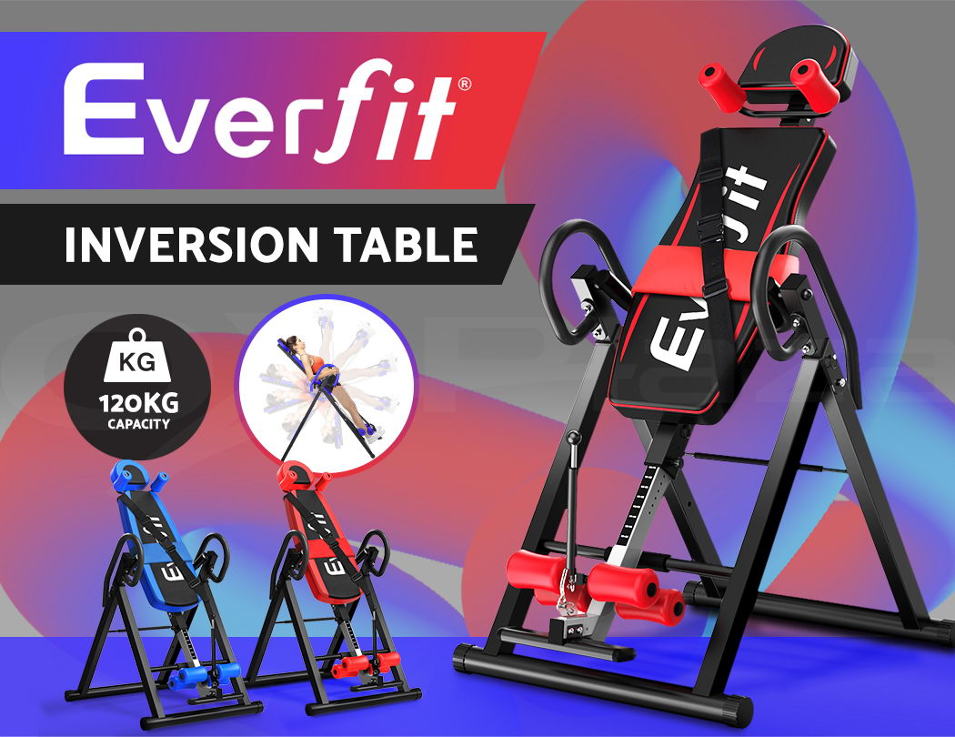 If you often suffer from back pain after a day of work, our Everfit Inversion Table may be the solution for you. Hanging upside down can help you improve flexibility, reduce nerve pressure, realign the spine and relax tensed muscles. The extra wide backrest is padded with high-density foam to provide you with adequate support and comfort. Inversion is adjustable up to 180° with three pre-set locking positions too. A safety belt and locking ankle clamp always keep you securely in place, the removable lumbar support cushion provides added comfort, and the padded U-frame handles ensure that you always have a firm grip and can easily return to the upright position. The sturdy frame is constructed with industrial-strength powder-coated rust-proof steel and can support a maximum weight of up to 120kg. The height can be adjusted to too, to accommodate all users. Best of all, the inversion table is foldable so you can easily store it away. Available in blue, black and red colours so that you can work out in style.