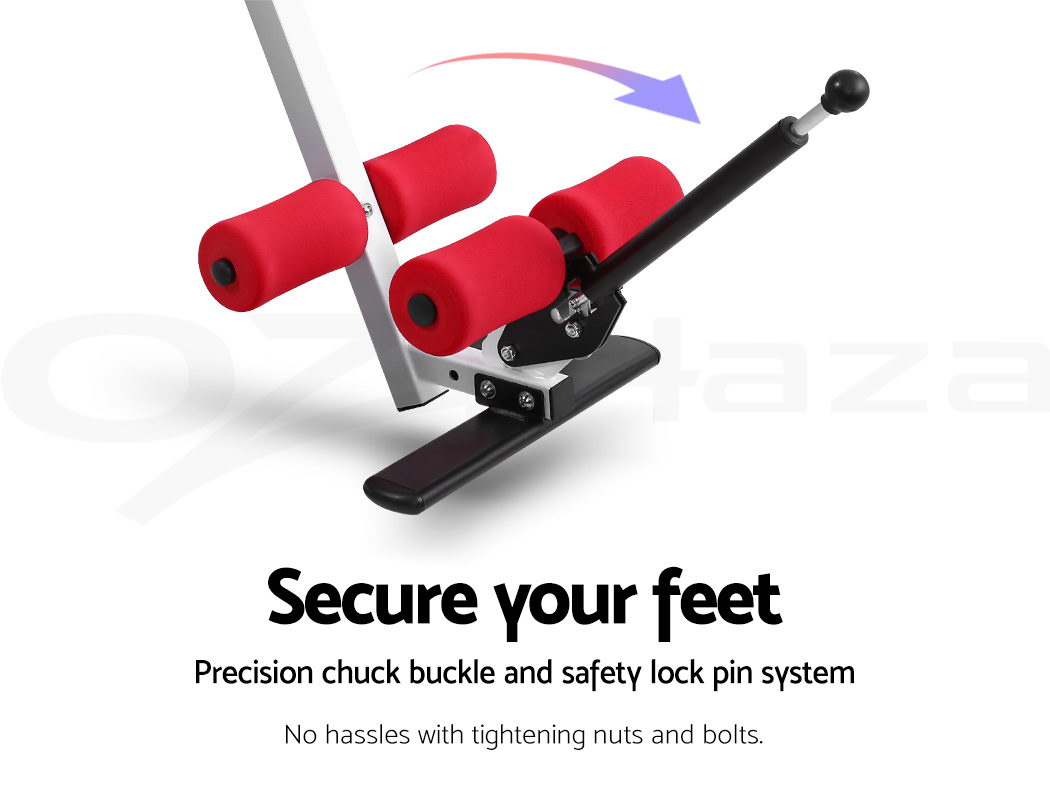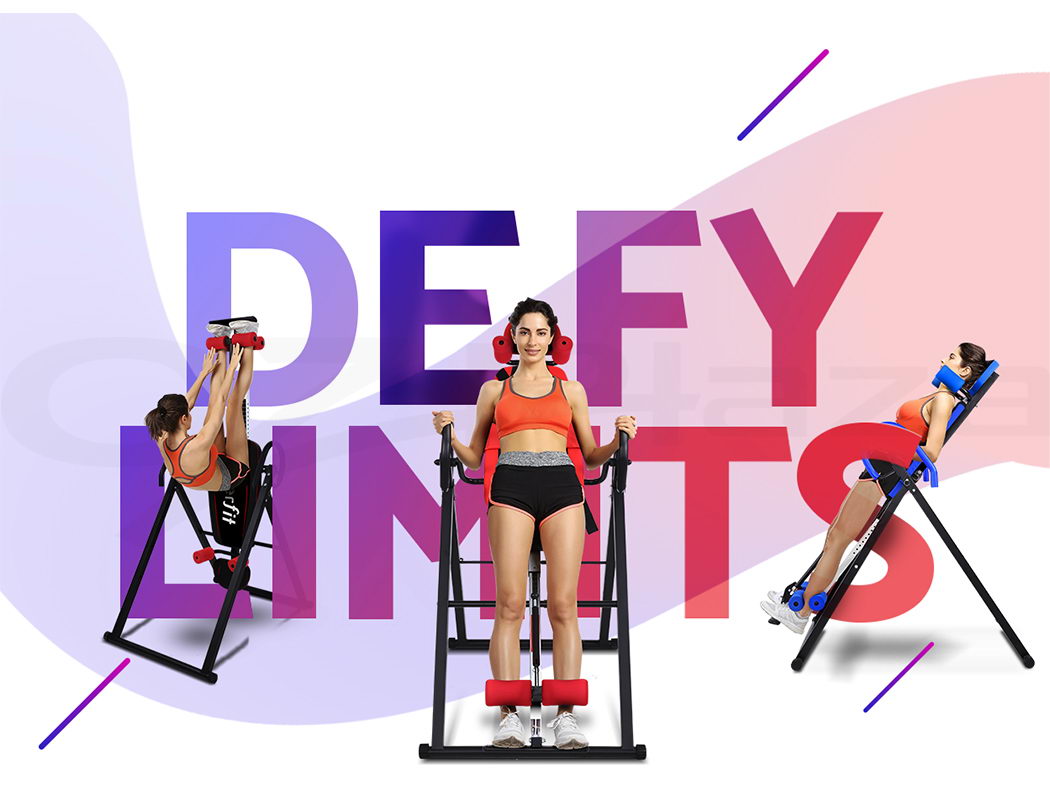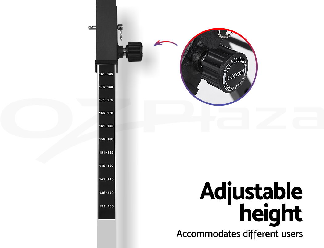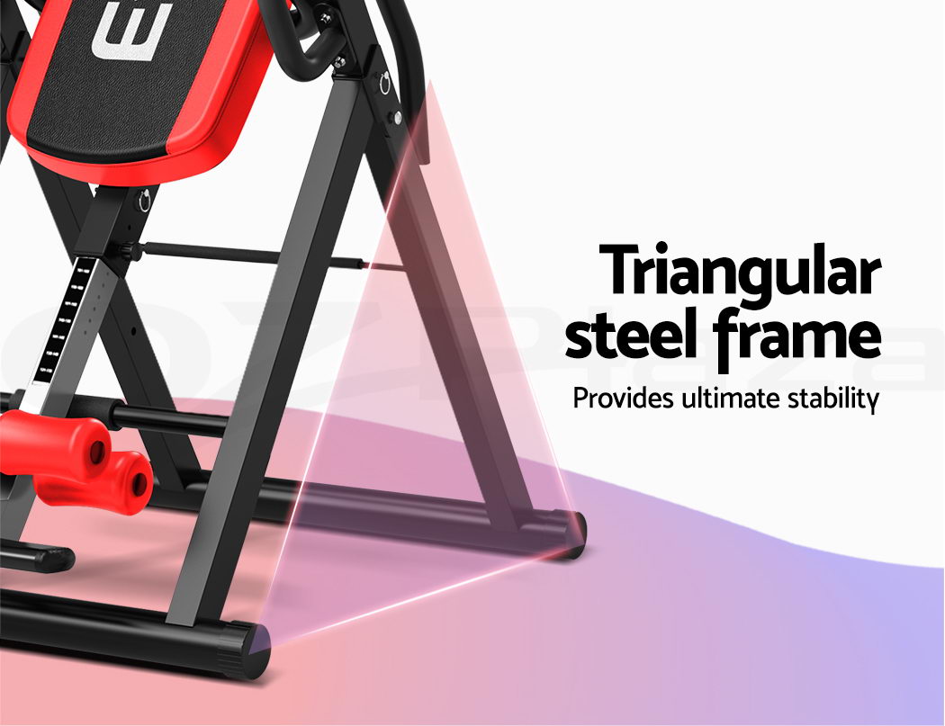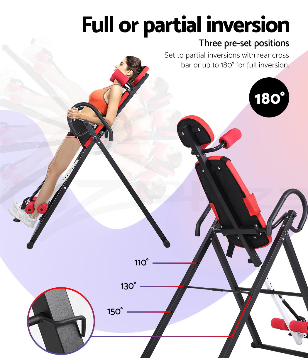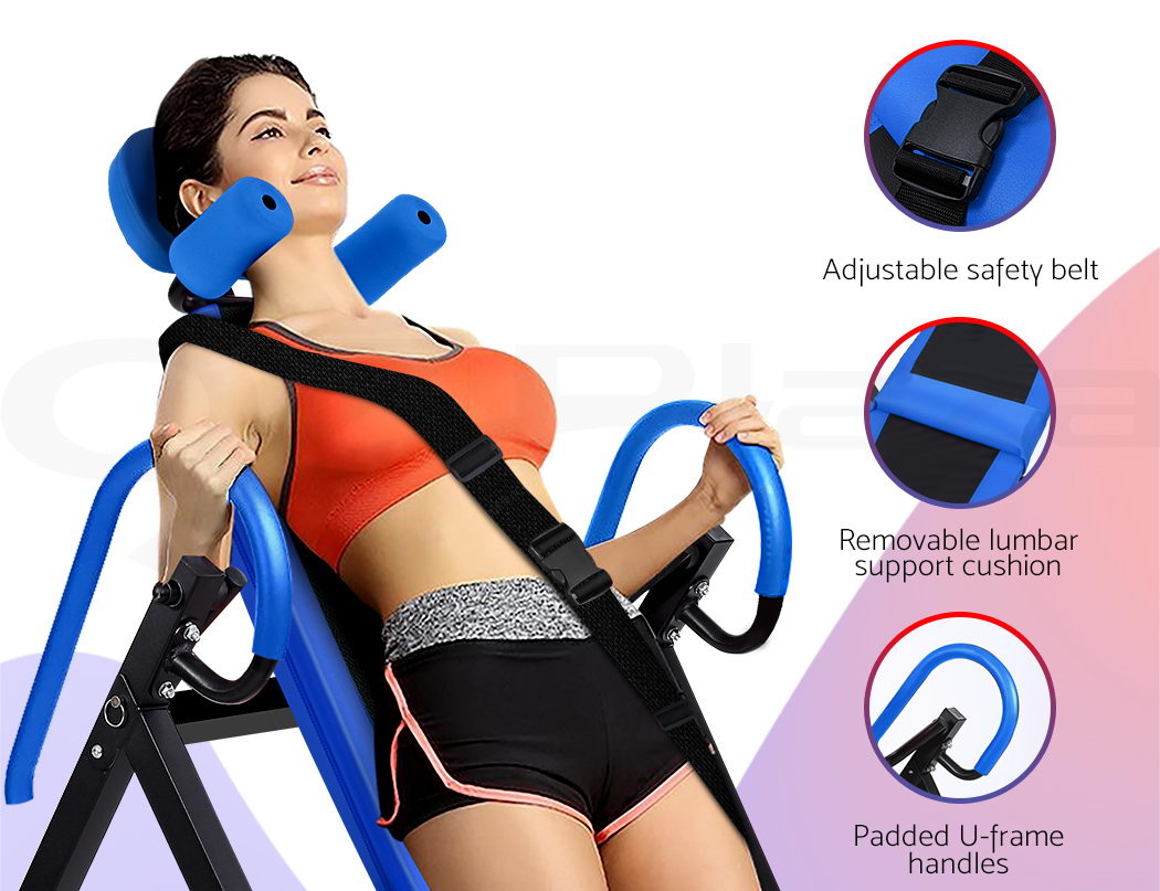 If you often suffer from back pain after a day of work, our Everfit Inversion Table may be the solution for you. Hanging upside down can help you improve flexibility, reduce nerve pressure, realign the spine and relax tensed muscles. The extra wide backrest is padded with high-density foam to provide you with adequate support and comfort. Inversion is adjustable up to 180° with three pre-set locking positions too. A safety belt and locking ankle clamp always keep you securely in place, the removable lumbar support cushion provides added comfort, and the padded U-frame handles ensure that you always have a firm grip and can easily return to the upright position. The sturdy frame is constructed with industrial-strength powder-coated rust-proof steel and can support a maximum weight of up to 120kg. The height can be adjusted to too, to accommodate all users. Best of all, the inversion table is foldable so you can easily store it away. Available in blue, black and red colours so that you can work out in style.