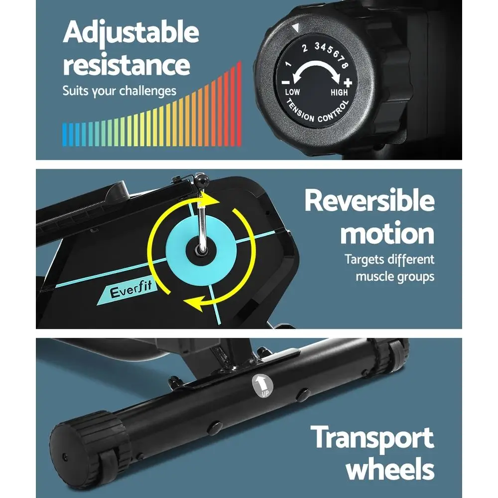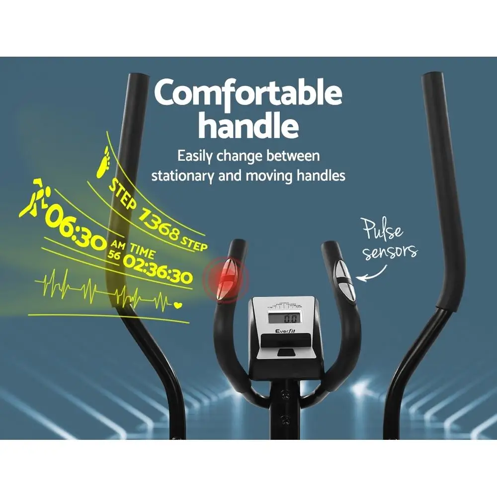 Elliptical cross trainers are excellent fitness machines for individuals who demand a training regimen that works on all muscles and yet eliminates the risk of impact injuries such as treadmill running or walking. Hence the trainers are particularly helpful for those with joint problems with knees and feet. Our Everfit Elliptical Cross Trainer is a very efficient low-impact cross trainer that offers adjustable mechanical resistance to tone every muscle in your body. In fact, up to eight levels of resistance can be adjusted to suit your challenges. The easy-to-read LCD display lets you keep track of your training parameters. Plus, the industrial-strength powder-coated steel frame is strong and sturdy with robust use. Other great features include built-in pulse sensors, moving exercise and stationary handles, rubber-clad pole grips and reversible two-way movement. Not least, the elliptical has built-in-wheels for portability, giving you flexibility to exercise whenever you want, anytime and anywhere.